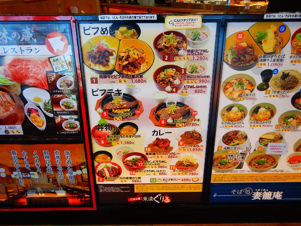 外にも中にもメニュー多くて悩んだぜぇ…ε=( ̄。 ̄;) 結局、ビフめし+小うどんで遅めのガッツリ朝ごはん。意外にも初の恵那峡サービスエリア。(たぶん)