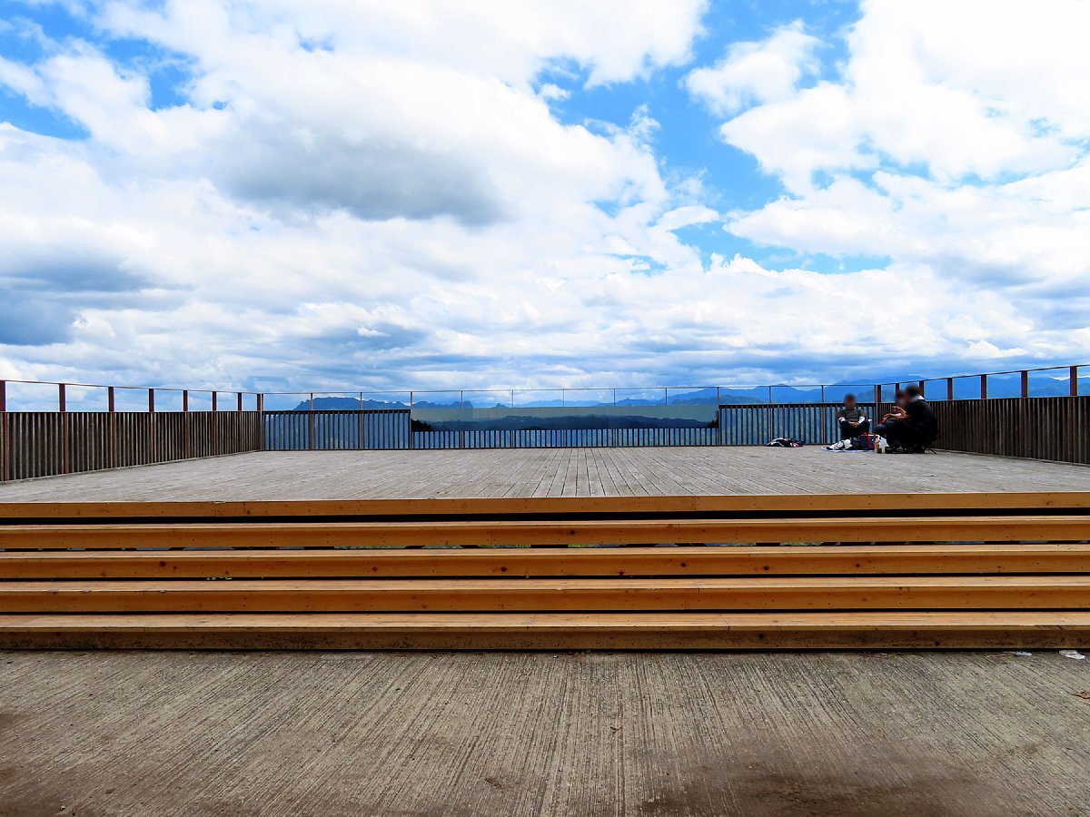 うおーーーっ!😲 山の名前がほとんどわからない!😅 奥秩父山塊方面だから、あの奥に富士山がある…はず… 尾根の重なり具合が圧巻。 あの橋は上野スカイブリッジ。 ウッドデッキも👍 御荷鉾スーパー林道の展望台。