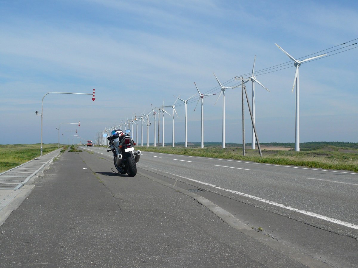 これぞ北海道!日本海側オロロンラインの絶景。北部の道道106号は日本海とサロベツ原野を見ながら走れる快適路。28基が並ぶ風力発電のプロペラは迫力満点ー!!