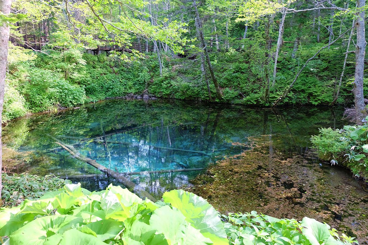 スゲー、神の子池。マジで水が青い!底まで見える透明度!沈んでる木々と写り込んだ木々がごちゃまぜになる神秘的な池w 写真撮りながらゆっくりまわっても10分ほどの小さい池だけど、いいところだなー。