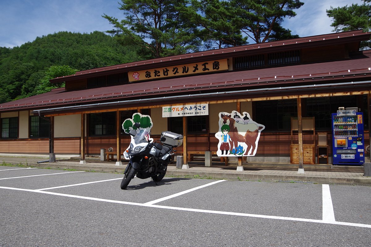 「木曽牛」とか「三岳グルメ工房」とか見えたから期待して寄ってみた道の駅「三岳」。木曽牛どころか、レストランもない。。まぎらわしいからやめてくれ。。水分補給してオブジェ見て近くの大きい道の駅へ。