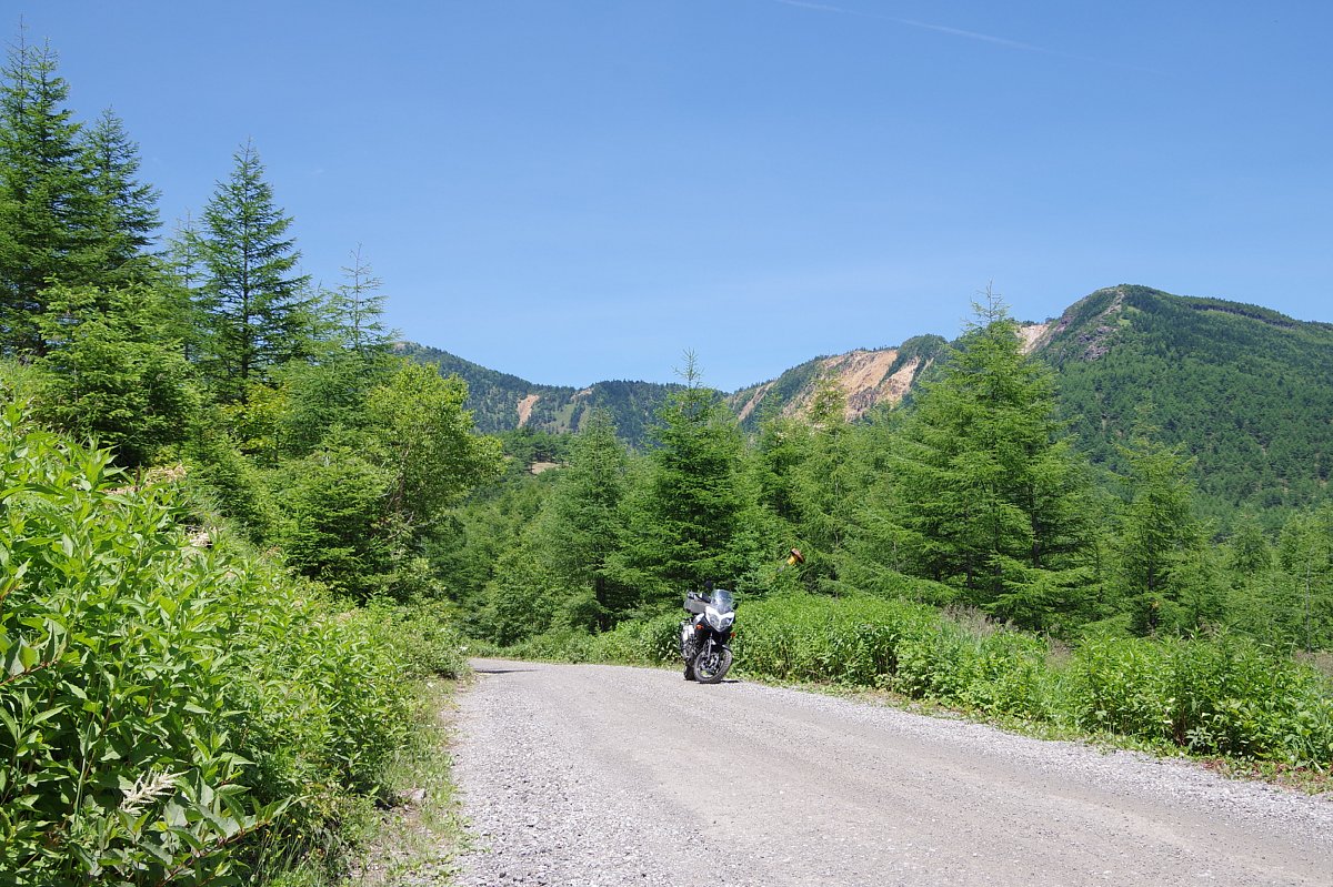 カーブが多い下りの砂利道はちょっと怖い。でも景色はサイコー!「池の平湿原有料駐車場」〜「アサマ2000パーク」の4キロほど。標高高いところ走ってるって感じがいい。