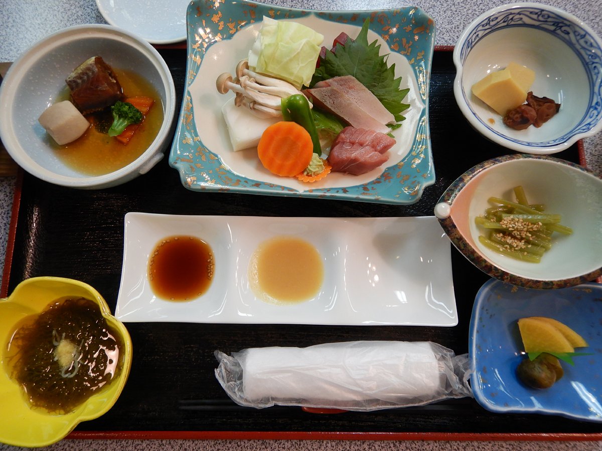 露天風呂から日本海に沈む夕陽を見られた「深浦観光ホテル」。豪華さはないけど、この土地ならではの料理がうれしいね。エレベーター内の「のどぐろ」のイラストにニヤッとした( ̄∇ ̄)