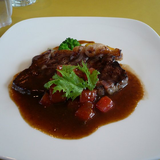 知多牛ステーキの贅沢ラ〜ンチ!(*´ー`*)表面だけ焼かれた肉の塊を自分で好みに焼いて食べるスタイル。サラダドレッシングもスープもいい感じ。住宅街にある旅館みたいなステーキハウス森牧場。