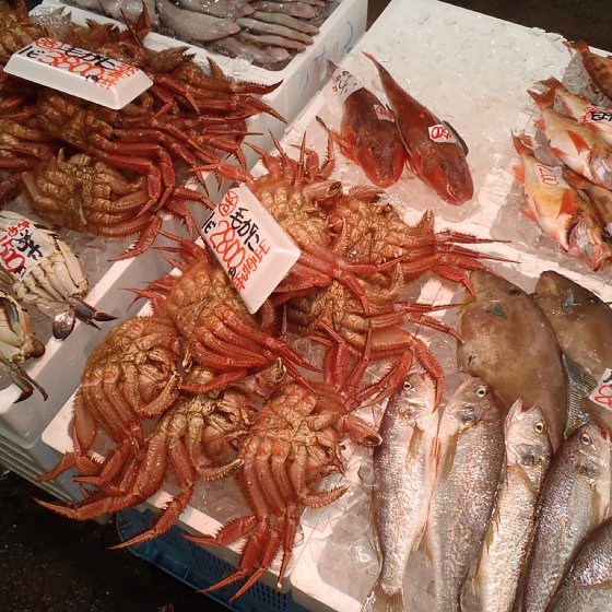朝から雨でテンションダウン。。。バイクは宿に置いたまま寺泊の魚市場通りへ。通称「魚のアメ横」。朝食後なのにつまみ食いw