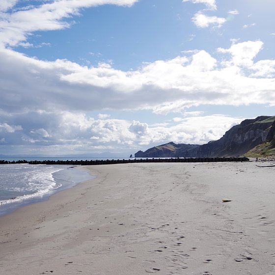全国では30ヶ所余りしか確認されていない鳴砂の海岸のひとつ。鉱物の種類や形、不純物の少なさなどの条件が揃わないと鳴砂にはならない「環境のバロメーター」。アイヌ人が「ハワノタ(声のある砂浜)」と呼んでいた地名があったというところから調査が始まって見つかった。北海道室蘭市。