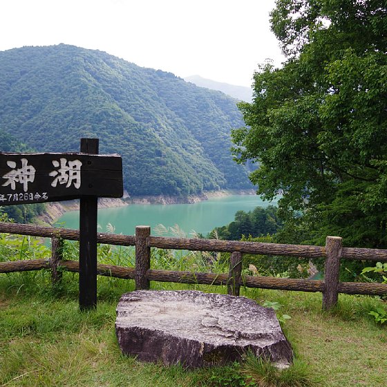 大町ダム・龍神湖を龍神湖展望広場から。う〜ん。まーまーかな。( ˘ω˘ ).。oO(大きいダムを見慣れるとこの展望はちょっとモノ足りない)