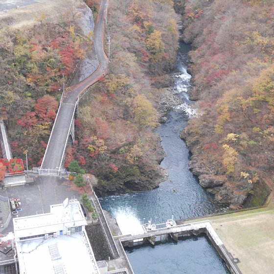 五十里ダム。「いかり」って読むらしい。景色はまずまず。老巧化してきたから、新たに放水路をつくってるらしい。水圧かかってるコンクリートの壁に穴あけるとか、一般人には想像もつかない工事。(・_・)