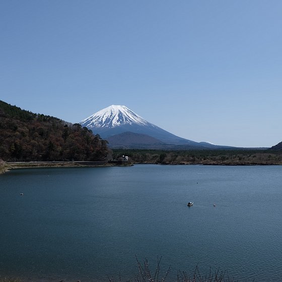 精進湖越しに見る富士山。富士五湖の中では一番小さくて認知度もないけど、静かーな感じが好きだなー。釣り人とカメラマンが数人いるだけで、河口湖のにぎやかさはまったくない。桜が咲く時期、ゆっくり休憩するならこのビューポイントが一番かも。