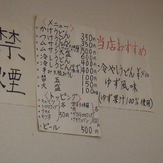 市街地からちょっと離れた国道139号沿いにある店。温冷どちらも食べられる「食べ比べセット」や、オススメ度が★で示されている。富士吉田うどんの香辛料「すりだね」は店オリジナル。山梨県富士吉田市。