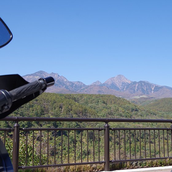 八ヶ岳高原ラインの東沢大橋。橋の東側にある展望台駐車場にバイク停めて八ヶ岳をバックに。紅葉時期はもっといいらしい。